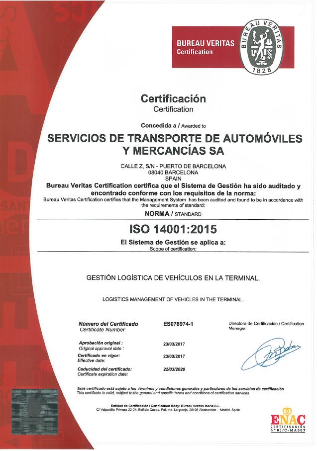 Barcelona, 30 de mayo del 2017.-SETRAM, Operador Logístico Multimodal, especializado en Logística de Automoción, ha obtenido el Certificado Ambiental ISO 14001, otorgado por Bureau Veritas. SETRAM demuestra así su compromiso con el medio ambiente gracias a una gestión certificada bajo dicha norma, reconocida internacionalmente. Bureau Veritas ha comprobado que SETRAM cumple los requisitos más importantes para identificar y controlar los aspectos medioambientales, especificados en la ISO 14001: